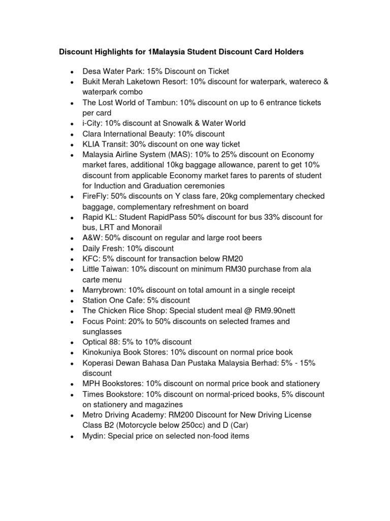 Discount Highlights For 1malaysia Student Discount Card Holders