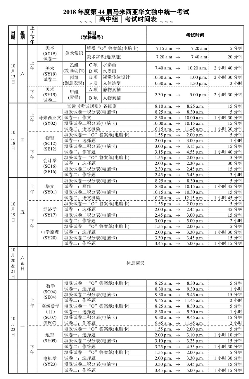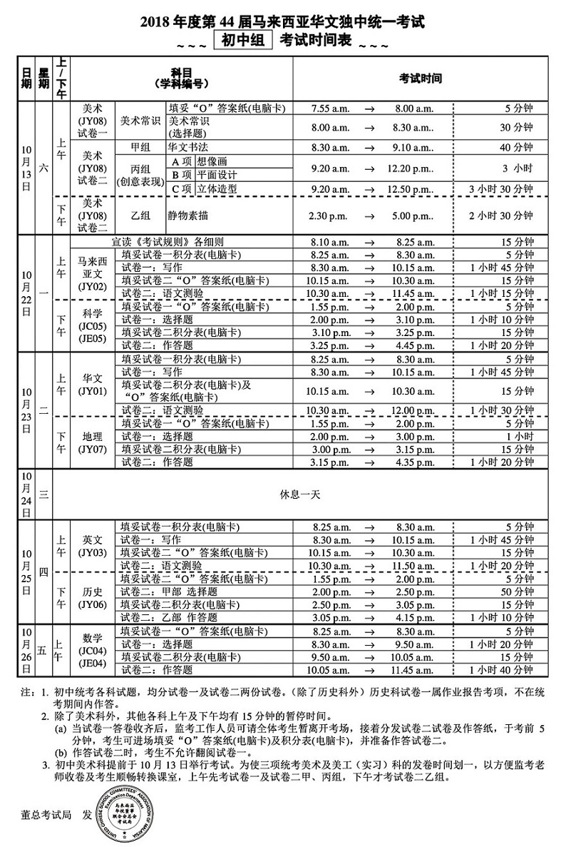 2019年度第二学期大考时间表 Chong Hwa Independent High School