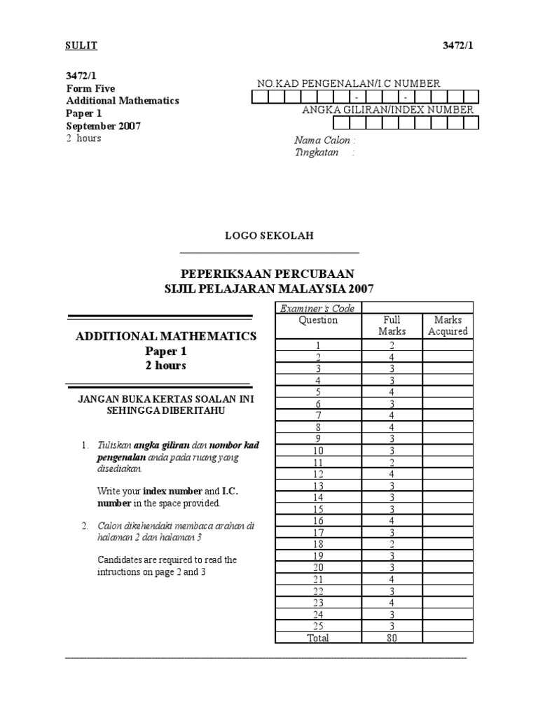Additional Mathematics Spm Paper 1 2018 Physics Mathematics Mathematics