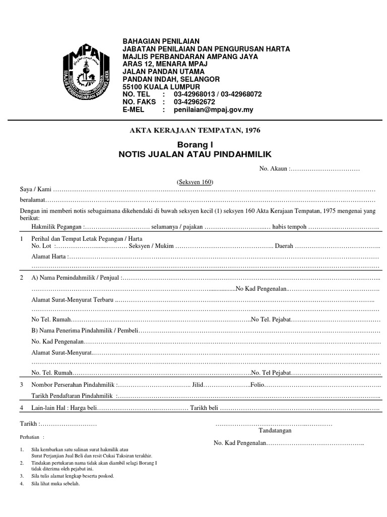Borang I Notis Jualan Atau Pindah Milik Pdf