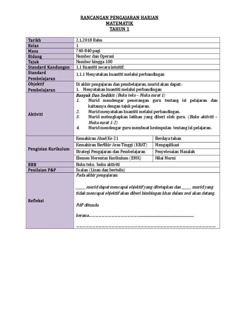 Rancangan Pengajaran Harian Matematik Tahun 1