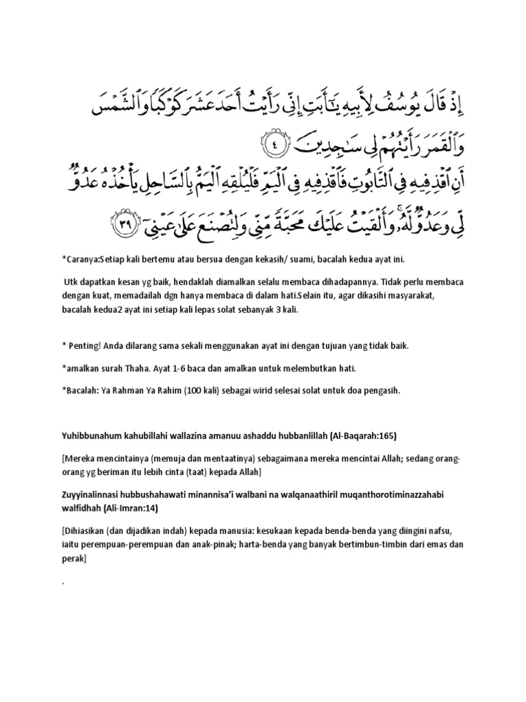 Ayat pengasih seterusnya adalah surah ali imran ayat 31. Suami akan berat hati dan susah untuk kahwin lain insyallah dengan izin allah ia berkesan jika anda amalkannya selalu. Amalan pengasihan islam ini bisa diamalkan oleh pria maupun wanita.
