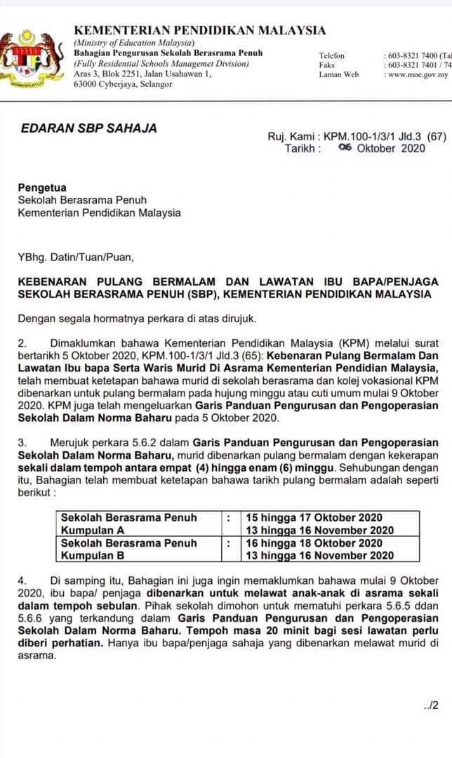 Ibu Bapa Dibenarkan Melawat Anak Di Asrama Sebulan Sekali Ikut Sop Terbaharu Cikgu Share