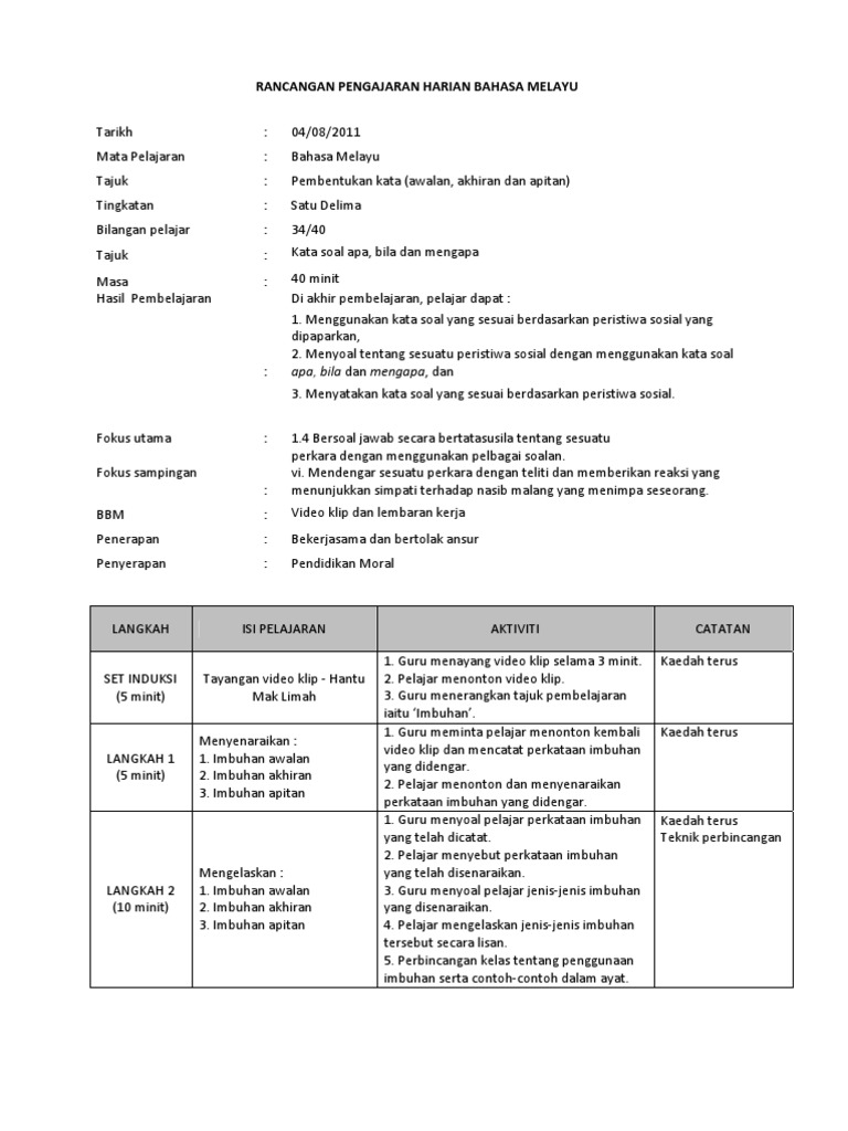 Rancangan Pengajaran Harian Kssm Tingkatan 1