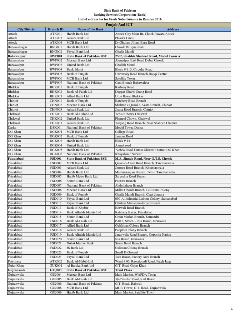 State Bank Of Pakistan Banking Services Corporation Bank List Of E Branches For Fresh Notes Issuance In Ramzan Pdf Free Download