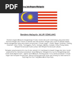 Perisai parti per silang yang mengandungi empat segmen berwarna putih merah hitam dan kuning dihiasi dengan coronet disokong oleh dua harimau dan berdasarkan tatal yang mengandungi dipelihara allah yang ditulis di jawi. Tiga belas negeri tersebut ialah johor kedah kelantan melaka negeri sembilan pahang perak perlis pulau pinang sabah sarawak. Bendera negara malaysia mengandungi 14 jalur merah dan putih melintang yang sama lebar bermula dengan jalur merah di sebelah atas dan berakhir dengan jalur putih di sebelah bawah tanda keanggotaan yang sama dalam persekutuan 13 buah negeri kedah negeri sembilan pahang kelantan johor perak terengganu perlis selangor melaka sarawak pulau pinang sabah wilayah persekutuan kuala.