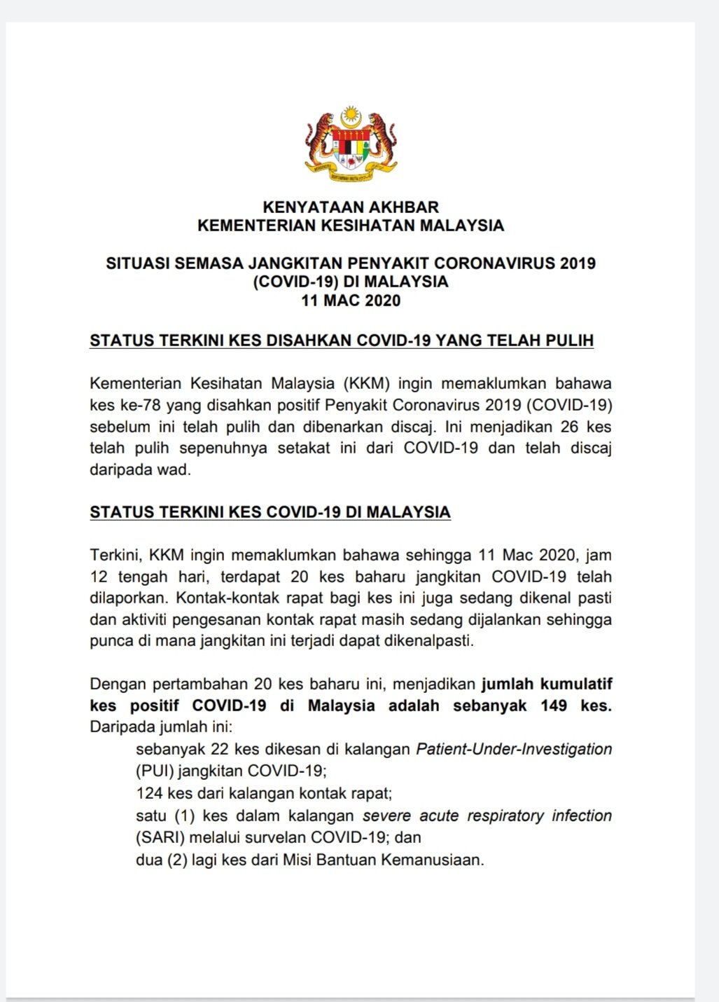 Kkmalaysia On Twitter Situasi Semasa Jangkitan Covidー19 Di Malaysia 11 Mac 2020 1 20 Kes Baru Menjadikan 149 Kes Setakat Ini 2 Kes Ke 78 Telah Sembuh Menjadikan 25 Pesakit Telah Sembuh Dan